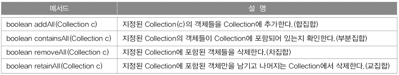 집합과 관련된 메서드 (Collection에 변화가 있으면 true , 아니면 false 를 반환)